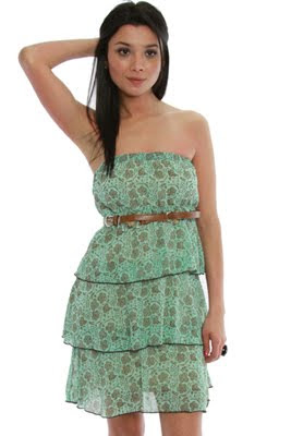Green Brown Flower Belted Strapless Dress $19.73